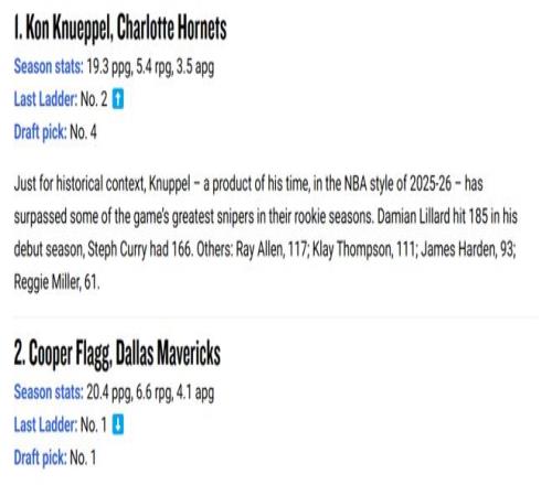 也正是凭借这样的表现,克努佩尔在NBA官网公布的最新一期新秀榜单中,成功超越“美国之子”弗拉格升至第一。