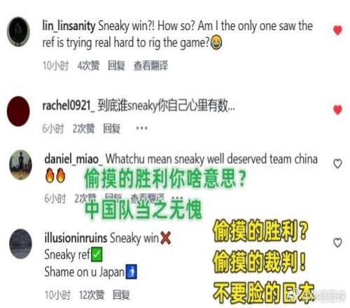 大批中国球迷涌入了评论区,给FIBA世界篮联留言怒怼:“到底谁偷偷摸摸你自己心里有数。”、“偷摸的胜利你什么意思?中国队当之无愧。”、“不是偷摸的胜利,而是偷摸的裁判。”,“偷摸的胜利?偷摸的裁判!不要脸的日本!”