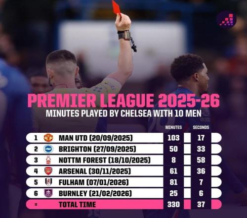 由于本赛季领到了6张红牌,切尔西在英超联赛中十人作战累计时长为330分钟37秒,为所有球队最多。