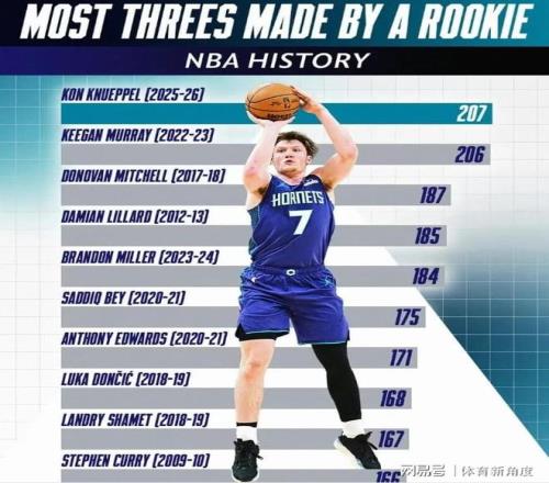 需特别指出的是,自2026年起,NBA三分球命中总数排名前三的球员中,有黄蜂队一员。黄蜂队的表现确实令人刮目相看!今日,克尼普尔三分球12投8中,加上这8记三分,其本赛季三分球命中总数已达209记,成功超越基根-穆雷。在命中这一记三分后,克尼普尔追平了基根-穆雷的新秀单赛季三分球纪录(此前为206记)。而这一记三分,更使克尼普尔荣登NBA历史新秀三分王宝座。