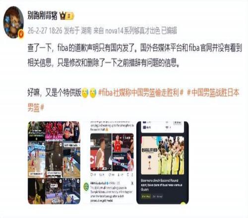直到舆论压顶,才悄悄删帖,改成了中性表述:“中国男篮下半场翻盘,击败日本男篮”。