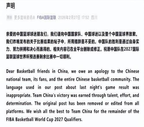 - “我们谨向中国男篮国家队、中国球迷以及整个中国篮球界致歉……中国男篮的胜利是通过自身实力、努力拼搏和决心而赢得。”