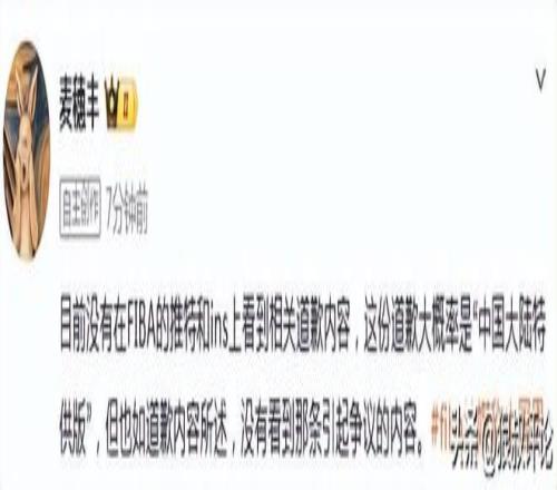 媒体人“麦穗丰”发文点评:目前没有在FIBA的推特和ins上看到相关道歉内容,这份道歉大概率是“中国大陆特供版”,但也如道歉内容所述,没有看到那条引起争议的内容。