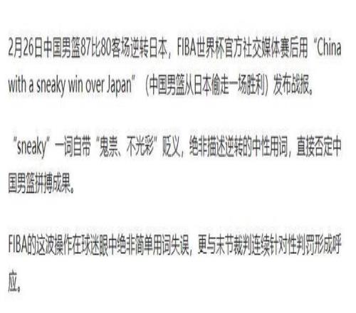 国际男联称“中国男篮偷走胜利”。
