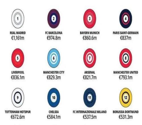 足球俱乐部收入榜单1至5名:皇家马德里、巴塞罗那、拜仁慕尼黑、巴黎圣日耳曼以及利物浦。皇家马德里以11.61亿欧元(折合人民币约94亿元)的年收入傲视群雄,俱乐部通过商品销售和赞助创造了超5亿欧元的年收入,而且已连续25个财年实现盈利。
