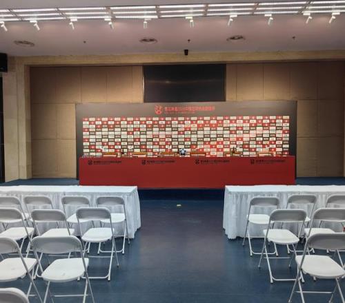 目前南京奥体中心内场已经布置好了超级杯的相关物料,场地草皮也较为平整。