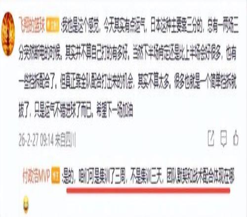 付政浩 认为,中国队下半场之所以能够逆转日本队,贺希宁和赵继伟的三分球起了关键作用,他在与球迷互动中充分肯定了贺希宁、赵继伟、廖三宁、胡金秋和朱俊龙的作用,称他们是取胜的五大功臣。他直言贺希宁真的是够拼,就得多用这种有能力敢拼敢打的选手。