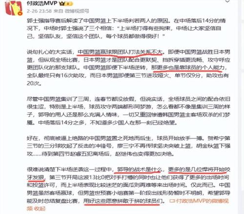 赛后,名记付政浩发表了多篇评论,有赞扬队员表现神勇的点评,有肯定贺希宁几个球员敢打敢拼的点评。但他也敢说真话,寻找胜利中的存在问题和不足。不得不说付政浩敢于说真话,他公开说中国男篮赢球跟团队打法关系不大,与郭士强战术无关,即便是下半场也看不到郭士强战术,全是依靠球员的个人能力实现了逆转,是依靠贺希宁和赵继伟的三分球打开了活路。