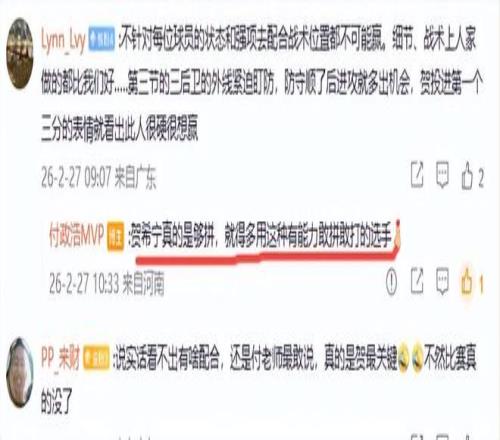 可是上半场贺希宁仅打了7分钟,而表现一般的王浩然、李弘权和毫不中用一分不得,数据挂0的张镇麟打得时间都比贺希宁多,这三人上半分别打了9分钟、10分钟和8分钟, 这也是上半场落后的一个原因。郭士强给贺希宁的战术地位并不高,半场仅有2次球权,而张镇麟有3次球权、李弘权有4次球权,他们的球权都比贺希宁多。这也是付政浩提出好好复盘的原因,希望以后的比赛中重用贺希宁这种有能力敢拼敢打的选手。从付政浩的评价来看,他认为有能力敢拼敢打的选手有5人,那就是贺希宁、赵继伟、廖三宁、胡金秋和朱俊龙,他希望要重用这些人。你们说呢?