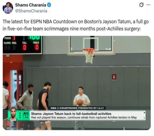 根据此前名记Shams报道,塔图姆已经全程参与5v5对抗训练,但在何时复出方面,凯尔特人依旧十分谨慎,完全遵循塔图姆的感觉与意愿。