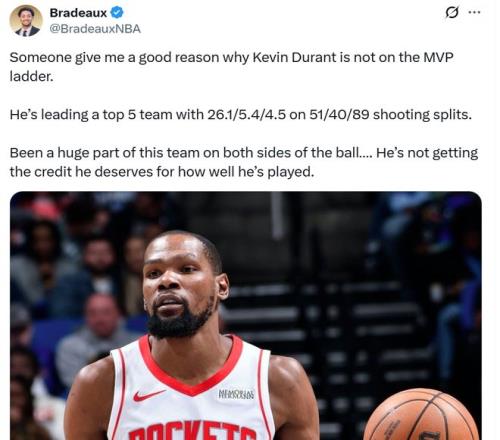 其中率领火箭队拿下连胜的杜兰特无缘前十惹火箭媒体不满,火箭媒体人Bradeaux晒出杜兰特的数据,场均26.1分5.4板4.5助,三项命中率51/40/89%,带领火箭杀入前五,却没能成为MVP前十候选人,谁能给我一个合理的解释?Bradeaux配文质疑道。