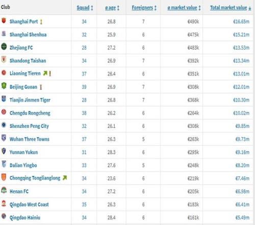 2月28日0时,中超冬季转会窗口关闭。《转会市场》的数据显示,上海海港以1665万欧元成为身价最高的中超球队。
