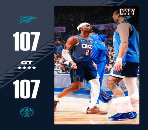 麦卡恩保持手感命中三分追平,95平后哈滕伸手打到穆雷面部被吹恶意犯规,两罚全中,约基奇三分中的,掘金队以100-95领先。雷霆队不甘示弱,哈滕空接扣篮,亚历山大中投得分,他们把差距缩小到1分。哈达威篮下打进,掘金队以102-99领先。雷霆队暂停后亚历山大跳投打铁,布劳恩中投得分,亚历山大两罚全中,卡鲁索底角投中三分,雷霆队追至104-105。约基奇三分不中,卡鲁索再中三分帮助球队反超,约基奇单打得分,第四节还有38秒时两队战成107平。雷霆队暂停后亚历山大失误,约翰逊三分不中,霍姆格伦拿到篮板,雷霆队在还有6.5秒时请求暂停。卡鲁索突破抛投不中,比赛进入加时赛。