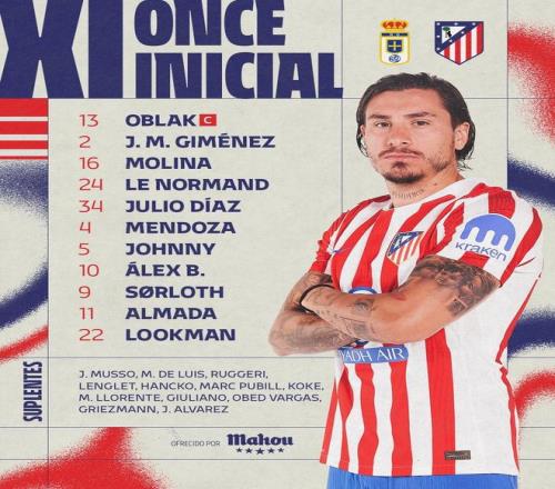 马竞首发:13-奥布拉克、16-莫利纳、2-希门尼斯、24-勒诺尔芒、34-迪亚斯、4-门多萨、5-卡多佐、10-巴埃纳、11-阿尔马达、22-卢克曼、9-瑟洛特