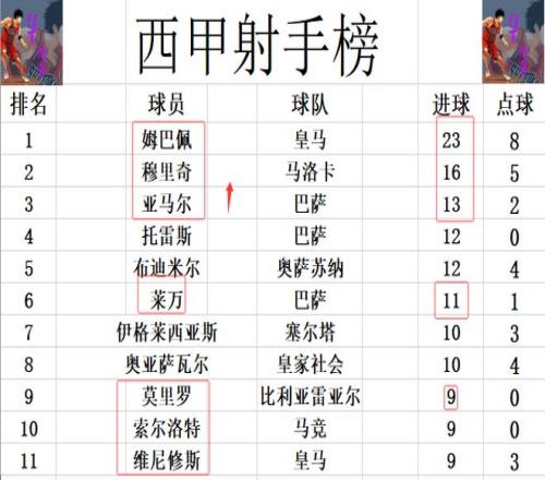 射手榜方面,姆巴佩23球领跑,穆里奇16位列第2。亚马尔上演帽子戏法后一举超过托雷斯等人,13球升到第3。莱万最后阶段打入1球,11球位列第6。莫里罗今天未能进球,还是和维尼修斯,索尔洛特等9球刚好挤入前十。