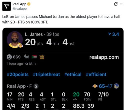 这让41岁61天的詹姆斯超越乔丹,成为NBA历史上能够半场拿到20+,且三分命中率100%最老的球员。