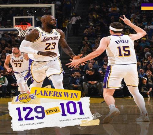 NBA常规赛继续进行,洛杉矶湖人队(35胜24负)止住连败重拾胜利。东契奇得到26分和8次助攻,勒布朗得到22分、7个篮板和9次助攻,他们率队前三节确立大比分优势,湖人队在客场以129-101大胜金州勇士队(31胜29负)。湖人队结束3连败。