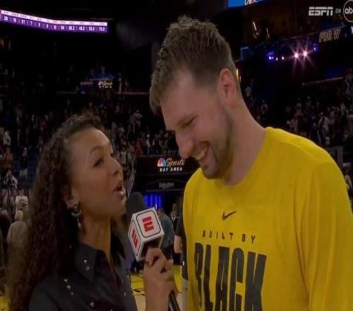 此役正值东契奇27岁生日夜,赛后东契奇在场边接受了ESPN的采访,女记者问到东契奇,“卢卡,谢谢你!还没祝你生日快乐呢,别想着就这么开溜,感觉如何?我们听到了你的队友们在为你唱生日歌,他们送你什么礼物了吗?”