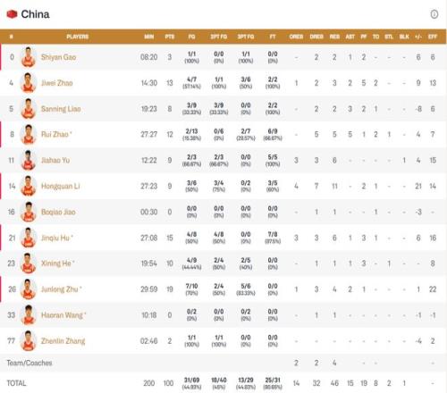 和上一场同日本的比赛一样,中国男篮再次体现出人多势众的优势,朱俊龙、胡金秋、赵继伟、赵睿、贺希宁5人得分上双,而第二次代表中国队出战的李弘权更成为篮板奇兵,一人抢下4攻7防11个篮板,率领全队在篮板球上以46比31大胜。而朱俊龙在三分线外6投5中砍下19分,带领全队打出44.83%的三分球命中率,压倒了同样手感火热、三分命中率高达40%的对手。