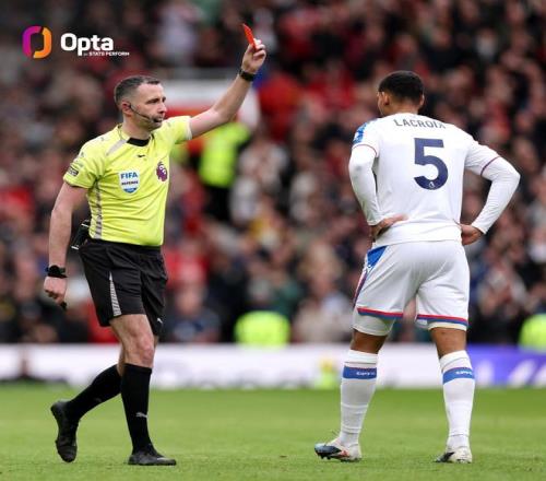 周日结束的一场英超第28轮比赛,水晶宫客场1-2遭曼联逆转,水晶宫中卫拉克鲁瓦破门,但之后又被红牌罚下。