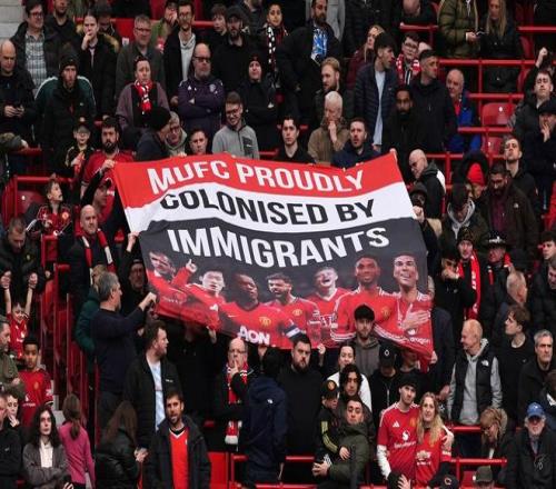 在拉特克利夫采访后的首个曼联主场赛事中,球迷打出醒目横幅:“曼联,自豪地被移民们‘殖民’”,并配上坎通纳、埃弗拉、朴智星、B费、索尔斯克亚、阿马德、卡塞米罗七位外籍球星的照片,直接回击老板的不当言论。