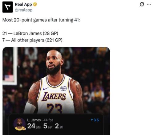 凭借这样的表现,詹姆斯在41岁之后出战28场比赛就已经21次单场交出20+得分表现再度刷新NBA历史纪录。