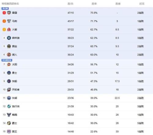 雷霆随着亚历山大复出,取得了2连胜,总战绩47胜15负,领先身后的马刺3场,再度巩固了自己的排名。马刺队优势也很大,领先第3的火箭5.5场,西部第2的位置无虞,能否抢到第1不好说!