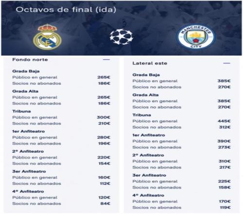 3月2报道 皇马官方公布欧冠1/8决赛首回合对阵曼城票价,价格从84欧元到445欧元不等。北京时间3月12凌晨4点,皇马和曼城的首回合将在伯纳乌进行。近几个赛季,皇马和曼城多次在欧冠赛场上相遇。