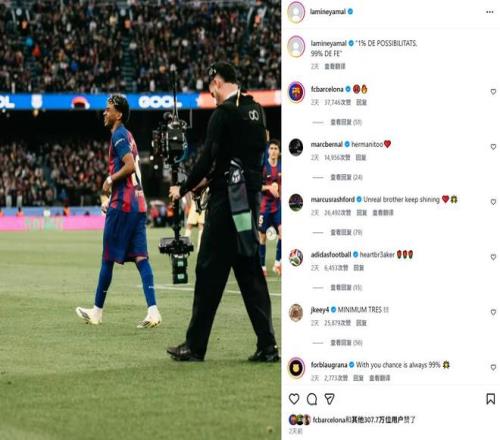 亚马尔也复制了这一信息,并用加泰罗尼亚语发布:“1% de possibilitats, 99% de fe”(1%的可能性,99%的信念)。