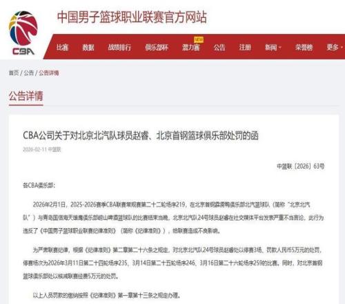 CBA公司迅速启动纪律程序,对其处以禁赛三场、罚款人民币五万元的顶格处罚;其所属俱乐部亦被同步核减联赛经费五万元。