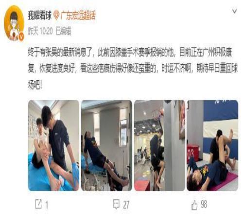 终于有张昊的消息了,原来张昊膝盖受伤了,已经接受了手术,目前在广州恢复,从照片来看,张昊的膝盖伤势有点严重,手术口很长,至少本赛季,张昊不会回归了。这次受伤,给张昊的职业生涯蒙上了一层阴影,随着崔永熙的复出,再加上陈家政、王洪泽的成长,广东恐怕很难有张昊的位置了。查了一下张昊的合同,他的B类合同于2027年7月31日到期。