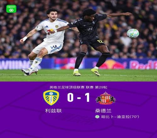 北京时间3月4日英格兰足球超级联赛第29轮,利兹联主场对阵桑德兰。下半场罗顿进球因越位被吹,哈比卜-迪亚拉进球打破僵局。最终比分利兹联 0-1 桑德兰。