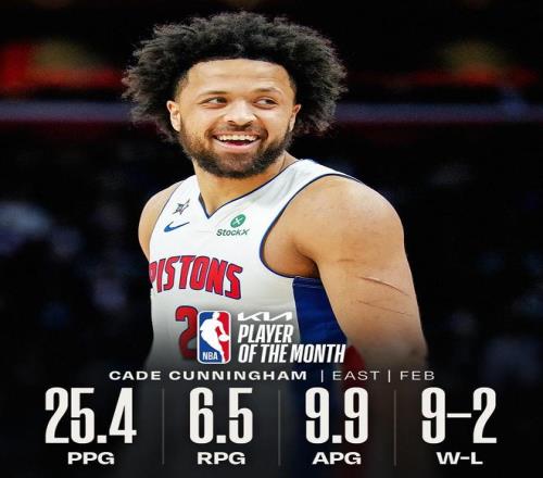 北京时间3月4日,NBA官方公布了2月份的东西部最佳球员,东部方面,坎宁安成功当选,西部的最佳球员则是文班亚马。