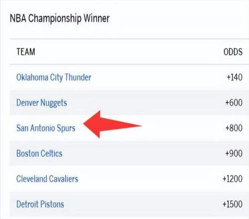 如今的马刺队夺冠赔率已经升至第三,雷霆+140、掘金+600、马刺+800。没想到马刺从摆烂的球队一下就变成了冲冠豪强了。