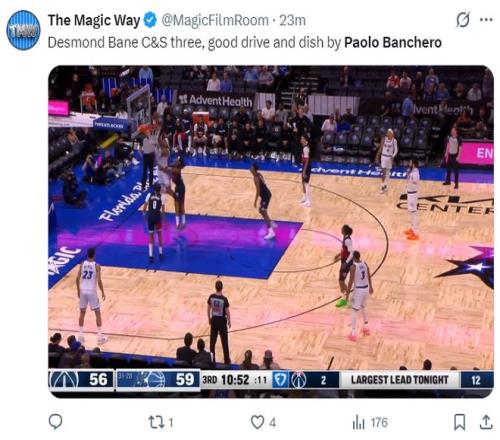 魔术核心保罗-班凯罗最大的问题就是稳定性不足,但面对奇才这种摆烂的球队他必然重拳出击,首节班凯罗8分钟里8中5+三分2中1+罚球2中2拿到13分2篮板1助攻,上半场打完他已经拿到18分。