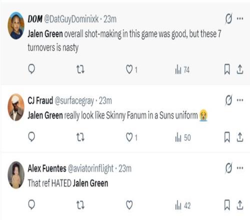 太多的太阳球迷炮轰杰伦-格林失误率过低+效率值低,本赛季格林场均13.5分,命中率36.7%,三分命中率27.6%。