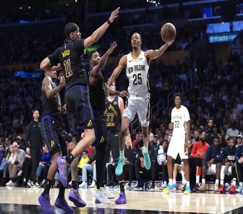 末节初端,湖人这边进攻不顺,被鹈鹕抓住机会一举领先到了8分,锡安反击上篮2+1打成,湖人暂停。暂停以后,湖人这边海斯先扣了,里夫斯进三分,老詹两罚不中以后,东契奇小抛投得分,湖人回敬一波12-0的小高潮。鹈鹕暂停,回到比赛,老詹空接,锡安篮下反篮止血,斯玛特关键三分命中领先到了7分,东契奇单挑墨菲三分还有杀死比赛。