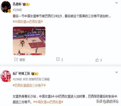 第四节,中国女篮单节只得到9分,被巴西轰出一波24-9进入加时。