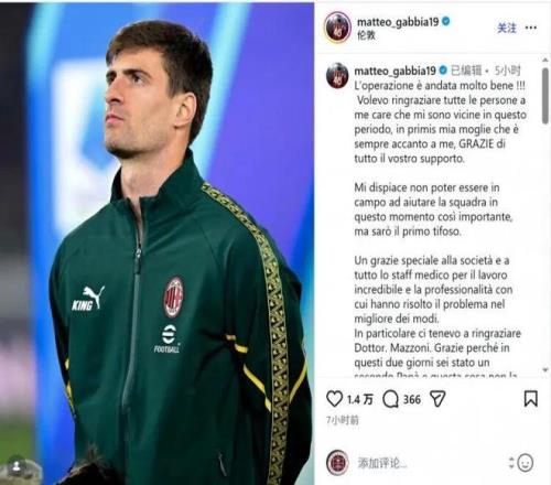 米兰后卫加比亚更新社媒动态,确认已成功接受腹股沟疝手术。