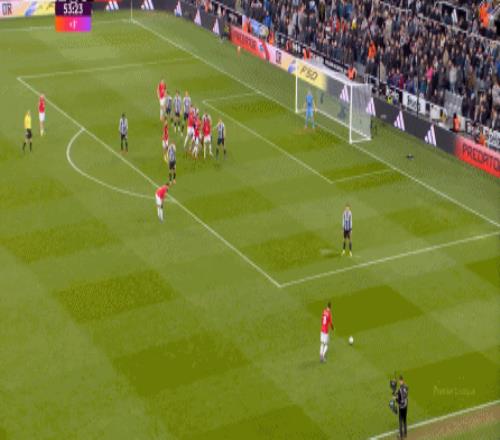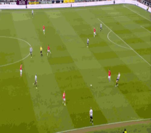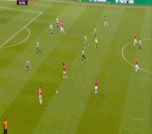 所以,当你的进攻端并不能自主成型,也无法等待对手强度大幅回落的情况下,曼联在上半场的进攻就显得有一搭没一搭了,比如球队的第一次进攻,来自前场抢断后打飞的远射: