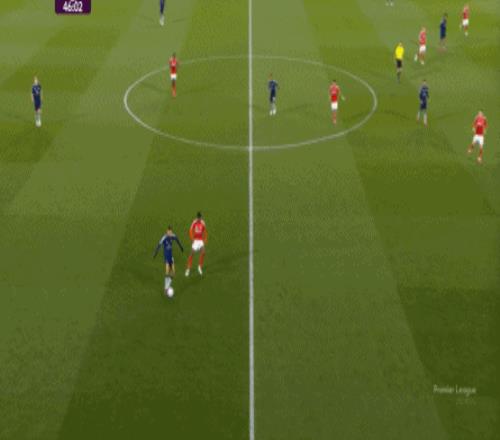 自己来到了边路,或者身前空间广袤,可以试着自己突破,但是,戈登选择了对自己球队推进成功率更高的线路: