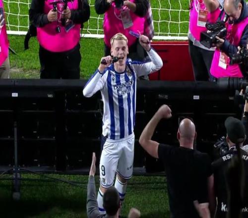 比赛结束之后,皇家社会球员奥斯卡松和球迷一起高声歌唱他的个人助威曲。