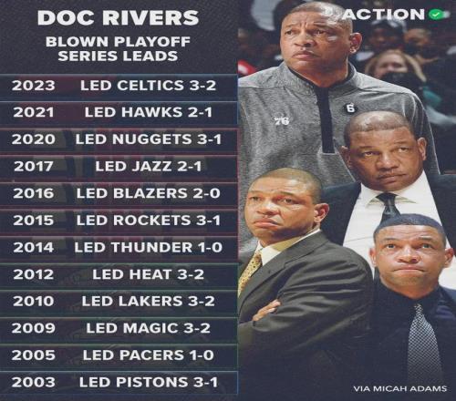 很多人嘲讽里弗斯是鸡汤大师,没什么真本事,尤其是季后赛频频被翻盘:1、当球队3-2领先时7次被翻盘;2、10次输掉抢七大战;3、32次输掉终结系列赛的比赛。这三项都是NBA历史纪录!NBA被逆转之王,绝对不是说说而已。