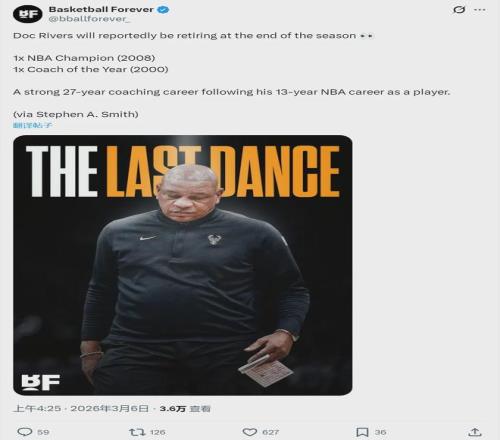 北京时间3月6日,NBA知名评论员A-史密斯在播客节目中透露,雄鹿主帅道格-里弗斯将在本赛季结束后退休,结束长达27年的执教生涯。A-史密斯说道:“里弗斯不会再执教了,这次是真的结束了,今年夏天他就要退下来了。”