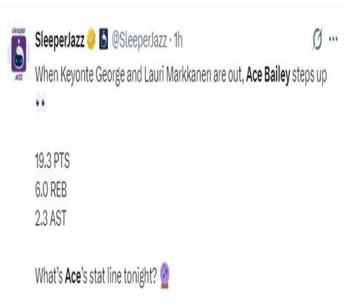 赛前爵士媒体晒出,本赛季马尔卡宁、乔治缺席时艾斯-贝利场均可以拿到19.3分6篮板2.3助攻,这位天才锋卫摇摆人身体天赋是没问题的。