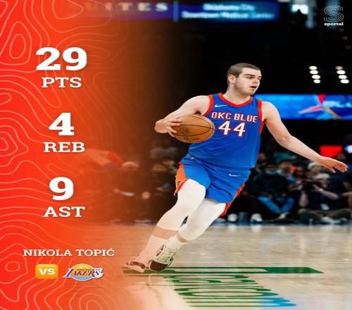 本场比赛中,虽然俄克拉荷马城蓝色输掉了比赛,但是被雷霆下放到NBA发展联盟赛场进行锻炼的后场新星尼科拉-托皮奇(Nikola Topic)的表现令人刮目相看。托皮奇全场出场34分钟,投篮18中10,三分线外6中2,罚球6中5,得到了全场最高分29分外加4篮板9助攻的数据,还有2次失误和4次犯规,正负值为-7。托皮奇在进攻端简直是势不可挡,他展现出了自己超强的得分能力,他也证明了自己有着丰富的进攻手段,他也是通过各种方式拿下了大量的得分。不仅如此,托皮奇也展现出了一定的传球能力和组织能力,他在这方面的表现同样是值得肯定的。只是球队绝大多数球员的表现比较一般,整体实力也有些不如对手,托皮奇即使表现不错,他也没有办法帮助球队扭转局面。