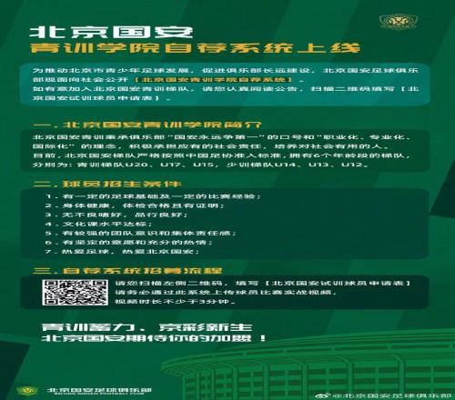 北京时间3月6日,北京国安官方发布公告,俱乐部面向社会公开青训学院自荐系统,为梯队招募球员。