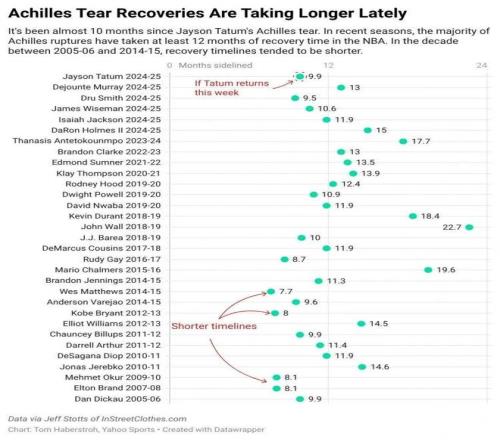 上图是2005年之后NBA遭遇跟腱撕裂球员的复出耗时,可以看出来,在2016年之前,许多球员(包括布兰德、科比等人)在8、9个月就完成复出,但是客观说,这几位复出之后的状态没有一个回到了巅峰水平。