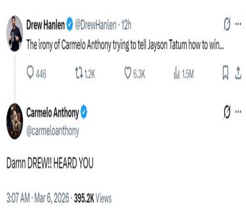 Hanlen随即正面回应,先是夸了一通安东尼的名人堂身份,然后话锋一转:“我的推文并不是贬低他,而是回应他关于塔图姆需要退居二线才能赢球的言论。塔图姆是NBA总冠军,季后赛系列赛战绩14胜6负,他知道如何赢球。”
