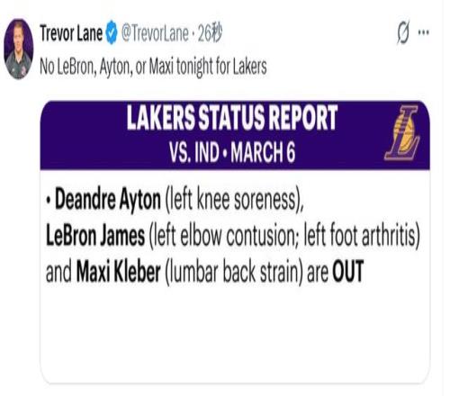 北京时间3月7日,湖人官方更新伤病名单,三名球员将缺席今日对阵步行者的比赛,分别是艾顿(左膝酸痛)、詹姆斯(左肘挫伤、左脚关节炎)以及克勒贝尔(腰部拉伤)。东契奇和里夫斯将率队力争获胜。